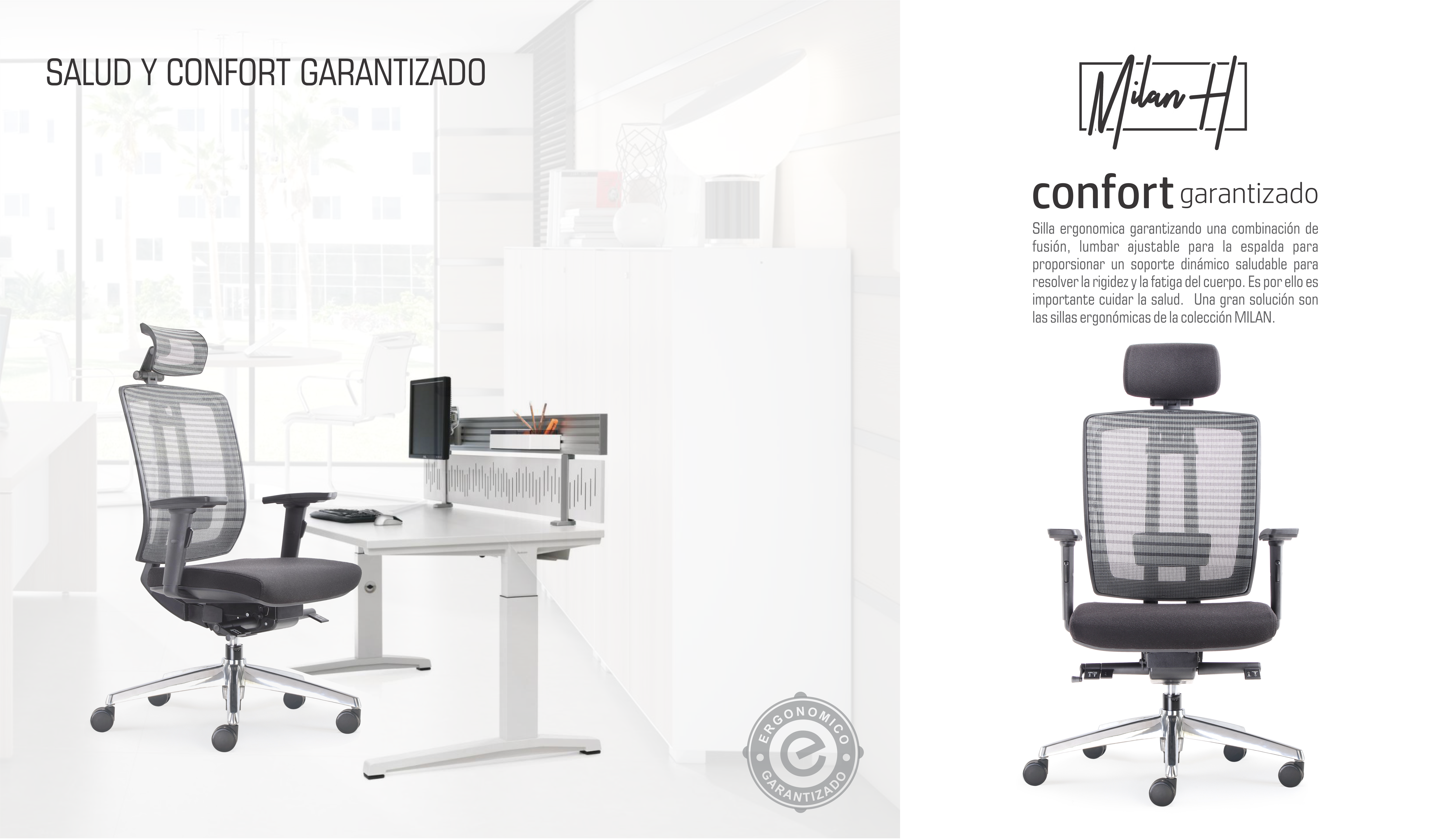 Silla ergonomica garantizando una combinación de fusión, lumbar ajustable para la espalda para proporsionar un soporte dinámico saludable para resolver la rigidez y la fatiga del cuerpo. Es por ello es importante cuidar la salud. Una gran solución son las sillas ergonómicas de la colección MILAN.